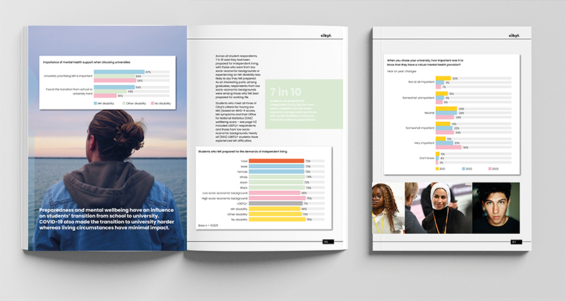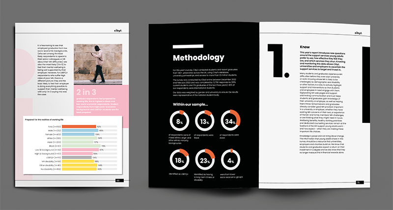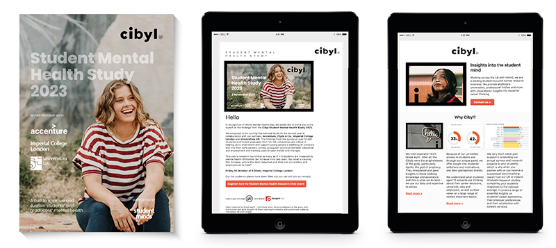 The 2023 annual Cibyl Mental Health Study explores the mental health of almost 13,000 students and graduates from more than 140 universities. A 96 page report and all associated marketing (HTML emails, social media posts, invites to the launch event, etc). This report is one in a series, the other being on Careers in Law, Student Cost of Living and research in support young LGBT people need to thrive into adulthood. I have designed and produced the full series. The mental Health Report here is a representative example of the series.